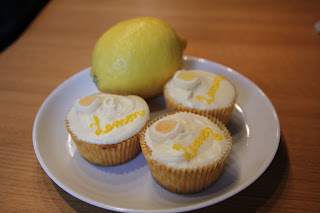 Först ut är mina fyllda citronmuffins. det är alltså helt vanliga citronmuffins, har använt rivet skal och inte saften då smaken blir mycket mer citron och mycket mindre sur då. Fyllningen är en citron-smörkräm som jag sprutat in efter att muffinsen kom ut ur ugnen. Överst är en glasyr med lite citron och vit choklad. Har inte smakat dem ännu så vet inte om de är goda, men visst ser de lite smarriga ut! Ovanpå har jag lagt en liten citronskiva och skrivit "lemon" med gul kristyr. Dessa var faktiskt lite roliga att göra! det tog lite tid och var flera moment, det gör det roligare. Är dessutom ganska nöjd med hur det blev tillsist. Måste dock öva lite på det där med att skriva med kristyr, SVÅRT!